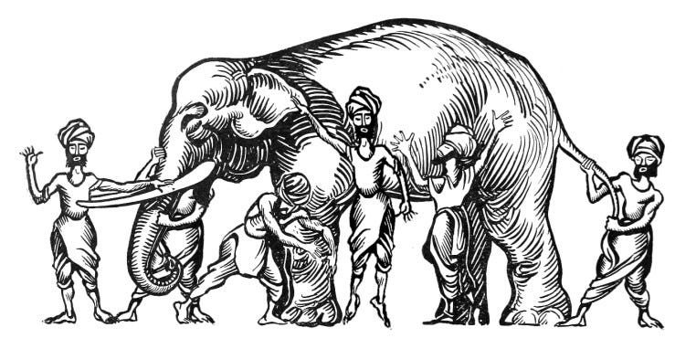 Now, depending on the version, the blind men either get in a fist-fight about who is right, or they cooperate and discover the whole is greater than the sum of its parts.